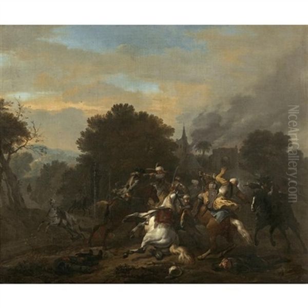 A Cavalry Skirmish Between Turks And Christians In A Wooded Landscape