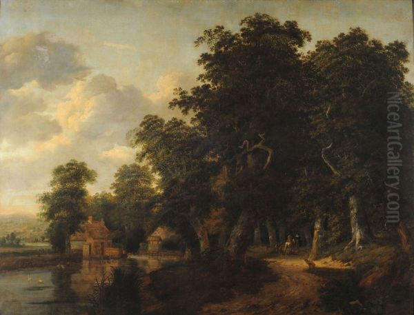 Wooded landscape with river and characters