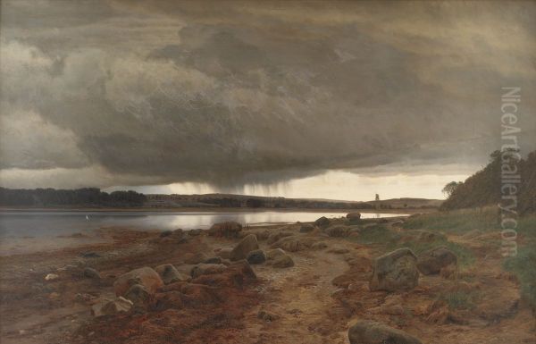 Standing before Janus Andreas Bartholin La Cour’s Regnvejr over stranden ved Kalø Vig (Rain over the Beach at Kalø Vig), one is immediately enveloped in the melancholic yet mesmerizing atmosphere of a Northern European coastline beneath a downpour. Painted in the mid-19th century, this Danish Romantic work captures the fleeting interplay of light and shadow as storm clouds loom over the rugged shore. La Cour, a lesser-known but skilled landscapist, employs a muted palette of grays, blues, and earthy tones to convey the quiet drama of nature’s unpredictability. The brushwork is细腻 yet expressive, emphasizing the transient quality of the weather and the raw beauty of Denmark’s Jutland Peninsula. Though not as celebrated as his contemporaries in the Golden Age of Danish painting, La Cour’s works like this one contribute to the Romantic tradition’s focus on emotion and sublime natural forces, offering a poignant glimpse into the era’s aesthetic preoccupations.