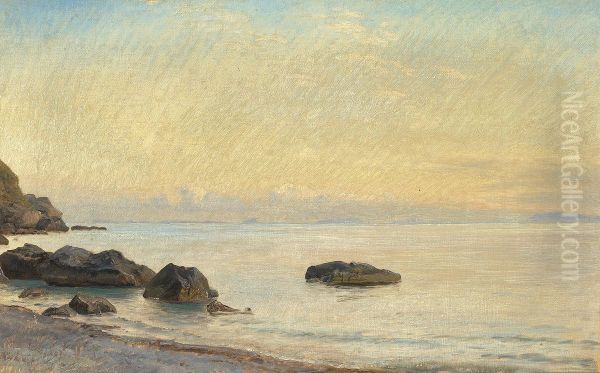 Janus Andreas Bartholin La Cour’s Strandparti fra Capri (Beach Scene from Capri) is a captivating Danish Golden Age painting that transports viewers to the sun-drenched shores of Italy. Executed in the mid-19th century, La Cour’s work reflects the Romantic era’s fascination with Mediterranean light and idyllic landscapes. The composition masterfully balances realism and atmospheric mood, with delicate brushwork capturing the play of sunlight on cliffs, sea, and figures. Its soft, warm tones and serene coastal setting evoke tranquility and escapism—an artistic pilgrimage shared by Northern European painters drawn to Capri’s legendary beauty. Though less renowned than contemporaries like Eckersberg, La Cour’s piece exemplifies Denmark’s romantic landscape tradition, bridging intimate observation with poetic idealism. The painting’s historical significance lies in its documentation of Scandinavian artists’ Italian journeys, blending Nordic precision with Southern European luminosity.