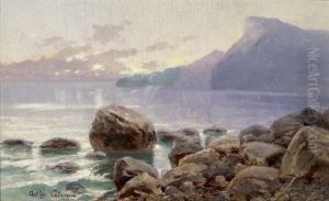 Arthur Calame’s Blick Auf Den Genfersee Bei Sonnenuntergang ("View of Lake Geneva at Sunset") is a mesmerizing celebration of light and nature’s grandeur. Painted in the mid-19th century, Calame’s work embodies the Romantic tradition of Swiss landscape painting, where dramatic skies and luminous waters evoke emotional depth. The sunset bathes Lake Geneva in golden warmth, contrasting with the darker silhouettes of mountains, creating a sublime harmony between tranquility and awe. Calame’s meticulous brushwork and mastery of atmospheric perspective place him among Europe’s finest landscape artists, bridging the precision of topographical art and the poetic idealism of Romanticism. This painting reflects the era’s reverence for nature’s majesty, making it a significant piece in both Swiss art history and the broader European Romantic movement.