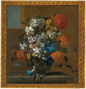 In Jean-Baptiste II Belin's Blumenstrauß in einer Vase auf einer steinernen Tischplatte (Flower Bouquet in a Vase on a Stone Tabletop), the viewer is transported to an intimate yet elegant moment of still life. Painted during the late 17th to early 18th century, Belin's work exemplifies the refined Dutch-Flemish floral tradition, characterized by meticulous botanical detail and a sense of quiet luxury. The rich hues of velvety roses, delicate tulips, and sprigs of foliage burst from a glass vase, contrasting against the subdued, cool tones of the stone table. Belin's skillful play of light creates a sense of depth and realism, while the dark background enhances the bouquet’s radiance. As the son of Jean-Baptiste Belin de Fontenay, a prominent still-life painter, the younger Belin continued his father’s legacy, contributing to the golden age of floral still lifes—works that not only showcased technical mastery but also symbolized transience and wealth in European aristocratic collections. This painting remains a testament to the enduring allure of Baroque floral art.