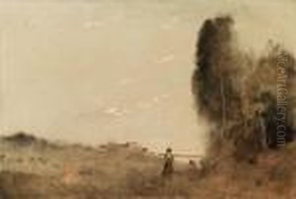 In Jean-Baptiste-Camille Corot's poetic masterpiece Le Matin Au Bord De L'eau (Morning by the Water), the artist transports viewers to a serene woodland scene suffused with golden dawn light. Painted during Corot's mature period (circa 1865-1870), this work exemplifies his signature paysage intime (intimate landscape) style blending realism with lyrical romanticism. Mist-veiled trees frame still waters where a solitary figure in rustic attire pauses mid-journey, creating profound tranquility through Corot's masterful tonal gradations of silvery greens and pearly grays. As a pivotal figure bridging Neoclassicism and Impressionism, Corot's atmospheric treatment of light influenced Monet and Sisley, making this painting an important touchstone in 19th-century landscape evolution. The composition's delicate balance between precise observation and poetic idealism captures nature's ephemeral beauty—a hallmark that secured Corot's reputation as "the father of modern landscape."