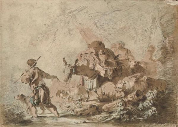A Peasant Family And Their Animals Crossing A Stream