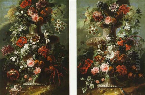 Still Lifes With Tulips, Roses, Poppies, Nasturtians And A Phesant Eye In Stone Urns