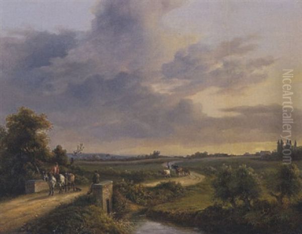 Jean-Baptiste de Jonghe’s Sommerlandschaft (Summer Landscape) immerses the viewer in a serene, sun-drenched pastoral scene, where light dances across lush greenery and tranquil water. Painted in the mid-19th century during the height of Romanticism, this work reflects de Jonghe’s mastery of landscape painting, blending precise detail with a poetic sensibility. As a Belgian artist influenced by the Barbizon School, his style bridges realism and idealism, capturing nature’s ephemeral beauty with a delicate interplay of light and shadow. Historically, de Jonghe’s landscapes contribute to the European tradition of plein-air painting, offering a quieter, more intimate counterpoint to the dramatic Romantic works of his contemporaries. Sommerlandschaft embodies this balance—its idyllic harmony and meticulous technique make it a notable example of 19th-century landscape art.