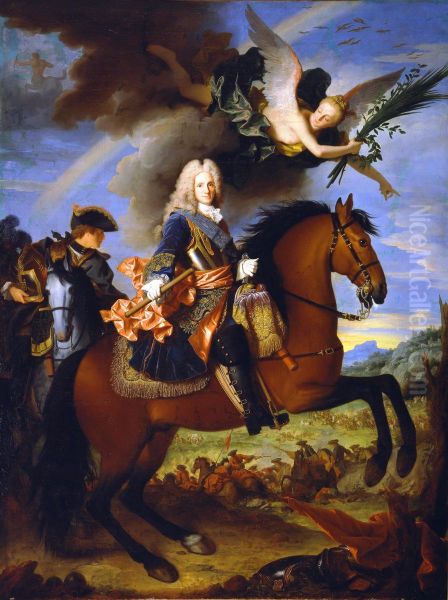 The Equestrian Portrait of Philip V of Spain by Jean Ranc is a striking Baroque masterpiece that exudes regal grandeur and dynamic energy. Painted in the early 18th century, this imposing work captures the Spanish monarch astride a powerful, rearing stallion, enveloped in luxurious drapery and gleaming armor. The dramatic contrasts of light and shadow, a hallmark of Baroque artistry, amplify the sense of movement and sovereignty. Ranc, a French court painter deeply influenced by Hyacinthe Rigaud, masterfully blends French elegance with Spanish solemnity, creating a visual tribute to Philip V’s Bourbon lineage and absolutist power. As one of the few equestrian portraits of the period, it holds a significant place in art history, embodying the political theater of monarchy while showcasing Ranc’s virtuosity in rendering texture and depth.
