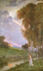 Joan Brull's Joven Con Mandolina (Young Woman with Mandolin) is a mesmerizing example of Catalan modernism, painted circa 1895 during the height of Spain's fin-de-siècle art movement. The delicate, dreamlike composition captures a young woman lost in contemplation as she cradles a mandolin, her elongated form and soft features reflecting Brull's affinity for Symbolist aesthetics. Bathed in a muted palette of pastel blues, pinks, and earthy tones, the painting exudes an air of poetic melancholy, blending Pre-Raphaelite lyricism with Art Nouveau’s flowing lines. Brull, though less renowned than his contemporary Ramon Casas, played a key role in Barcelona’s modernist circles, and this work exemplifies his mastery of evocative, introspective portraiture. Today, Joven Con Mandolina serves as a poignant reminder of Catalan modernism’s fleeting beauty and its bridge between academic tradition and avant-garde experimentation.