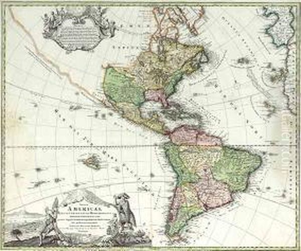 Johan Baptist Homann's Landkarte 'Americae' (early 18th century) is a masterful cartographic engraving that captures the grandeur and mystery of the New World before the age of modern exploration. Richly decorated with elaborate cartouches, swirling seas, and mythical figures, the map blends Baroque artistry with scientific ambition—a hallmark of Homann’s Nuremberg workshop, renowned for its precision and artistic flair. The work reflects Europe’s fascination with the Americas, framing the continent as both a land of opportunity and uncharted wonder. Its detailed coastlines, exaggerated topographies, and allegorical scenes (like indigenous people and exotic wildlife) reveal the era’s blend of empirical inquiry and romantic imagination. A prized example of golden-age cartography, Homann’s map occupies a pivotal place in art history, bridging geographic documentation and decorative art, and remains a testament to the Enlightenment’s thirst for knowledge.