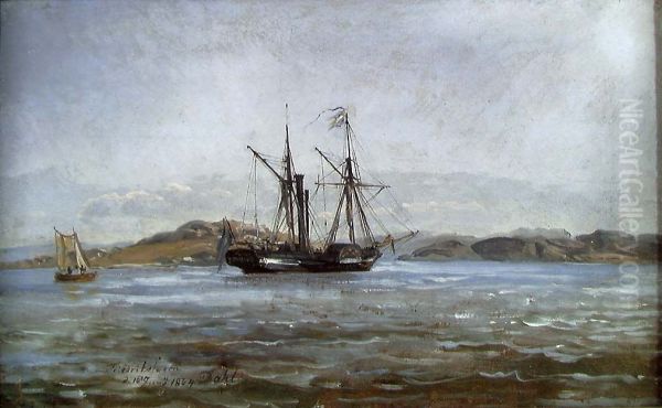 Johan Wilhelm Ludwig Dahl's A Steamer near Fredriksvern (Stavern) is a captivating maritime scene that effortlessly blends realism with the Romantic era's reverence for nature. Painted with meticulous attention to atmospheric effects, the work depicts a steamship gliding through tranquil waters near the historic Norwegian naval port, bathed in soft, diffused light that enhances the scene's serenity. A master of the Norwegian Golden Age, Dahl expertly balances technical precision—evident in the ship's sturdy form and delicate reflections—with a moody, almost poetic sensibility. The composition's subdued yet strategic use of color, particularly the cool blues and grays of the sea and sky, reinforces a sense of quiet grandeur. Historically significant, this piece exemplifies the transition from Romanticism to early realism in 19th-century Scandinavian art, marking Dahl as a key figure in Nordic landscape painting.