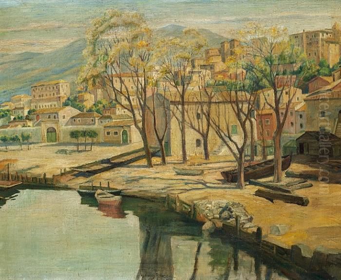 Johan Gudmann Rohde’s "Terracina Seen From The Canal" is a captivating depiction of serene coastal life, bathed in soft Mediterranean light. Painted during the late 19th or early 20th century, this work exemplifies Rohde’s skillful interplay of Impressionist techniques and Symbolist sensibility, blending loose brushwork with poetic tranquility. As a Danish painter and designer closely associated with the Skønvirke movement—Denmark’s answer to Art Nouveau—Rohde infused his landscapes with a harmonious balance of natural beauty and decorative elegance. The painting portrays Terracina, an Italian seaside town, with its sunlit buildings shimmering against tranquil water, evoking a timeless sense of escape. Though less internationally prominent than his silverware designs for Georg Jensen, Rohde’s landscapes like this one remain treasured for their lyrical atmosphere and contribution to Nordic modernism, bridging romantic tradition and emerging abstraction.