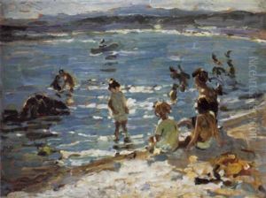 Sommerliche Kustenlandschaft Mit An Land Liegendem Segelboot Und Figurenstaffage.