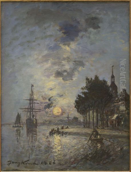 Under the ethereal glow of a silver moon, Johan Jongkind’s Gezicht op het Groothoofd te Dordrecht bij maanlicht (View of the Groothoofd in Dordrecht by Moonlight) transports viewers to a tranquil night along the Dutch canals. Painted in 1872, this masterpiece captures the quiet majesty of Dordrecht’s historic Groothoofdspoort gate, its reflection shimmering in the still waters. Jongkind, often hailed as a forerunner to Impressionism, masterfully balances realism and atmosphere with delicate brushwork and a subdued yet luminous palette. Unlike daylight scenes, this nocturnal composition exudes a dreamlike serenity, where moonlight bathes the architecture and boats in soft blues and silvers. His innovative treatment of light and shadow influenced contemporaries like Monet, cementing his role as a bridge between Romanticism and the Impressionist movement. Today, this work remains a celebrated example of 19th-century European landscape painting, embodying Jongkind’s unique ability to evoke mood through subtle tonal transitions and poetic naturalism.