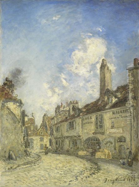 Johan Jongkind’s Strasse in Nevers captures a tranquil yet vibrant street scene, bathed in the soft, diffused light characteristic of his plein-air sketches. Painted in 1865, the work reflects Jongkind’s mastery of atmospheric perspective—a bridge between Romanticism and Impressionism—where loose brushstrokes and a muted yet luminous palette evoke the fleeting effects of light and weather. The composition, likely inspired by the French town of Nevers, showcases his Dutch realist roots while foreshadowing the Impressionist movement; Monet himself credited Jongkind as a formative influence. Though less celebrated than his contemporaries, Jongkind’s ability to infuse everyday urbanity with poetic realism secured his niche in art history as a pivotal precursor to modern landscape painting.