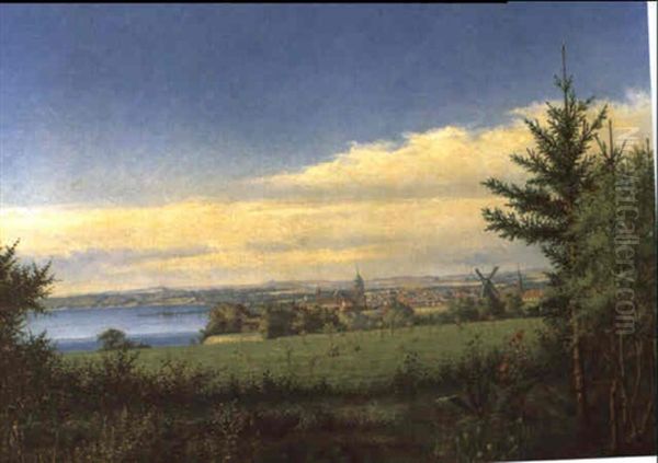 Johan Peter Bless’s Blick Über Aarhus captures the serene beauty of Denmark’s second-largest city with an exquisite play of light and atmosphere. Painted in the late 19th century, the work exemplifies the Danish Golden Age’s transition into plein-air realism, blending meticulous detail with a poetic sensitivity to natural light. The composition guides the viewer’s gaze across the rooftops of Aarhus toward the distant harbor, rendered in soft, hazy tones that evoke a sense of tranquil nostalgia. Bless, though less internationally recognized than his contemporaries like P.S. Krøyer or Vilhelm Hammershøi, was instrumental in documenting Denmark’s urban and coastal landscapes during industrialization. The painting’s historical value lies in its rare pre-modernist depiction of Aarhus—a city then on the cusp of transformation—making it a significant artifact of Danish cultural heritage. Its subdued palette and balanced composition reflect the quiet dignity of Nordic Romanticism, bridging the gap between traditional landscape painting and emerging realist tendencies.