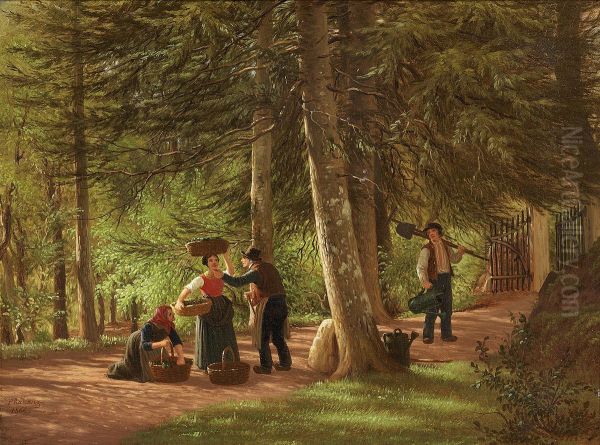 The painting A Road through the Woods with Persons in Conversation by Johan Peter Raadsig (1806–1882) transports viewers to a serene forest path bathed in dappled sunlight, where figures engage in quiet dialogue amidst nature. A Danish Golden Age painter influenced by Romanticism, Raadsig excelled in capturing atmospheric landscapes infused with narrative subtlety. This work epitomizes his delicate handling of light and texture—sunbeams filtering through foliage, earthy tones harmonizing with muted greens, and figures rendered with restrained yet expressive detail. While less famed than his contemporaries like Christen Købke, Raadsig’s oeuvre contributes to the Northern Romantic tradition, blending intimacy with grandeur. The painting’s quiet dynamism—a momentary pause within nature’s timelessness—reflects the 19th century’s reverence for nature as both sanctuary and muse, positioning it as a understated gem within Scandinavian Romantic art.