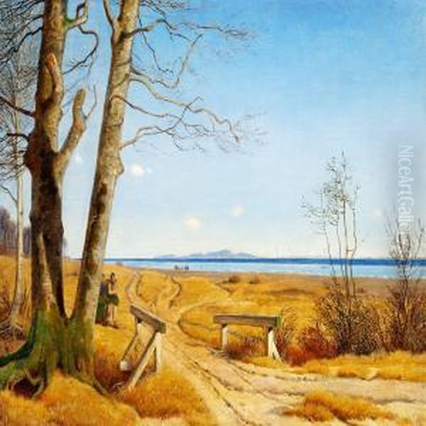 Johan Thomas Lundbye’s Wintry Scene Without Snow (1843) is a poetic masterpiece of Danish Golden Age painting, capturing a serene, muted winter landscape devoid of snow yet brimming with quiet melancholy. The composition features a vast, overcast sky dominating a barren field, where leafless trees and a lone figure—possibly a shepherd—evoke solitude and contemplation. Lundbye’s delicate brushwork and restrained palette of earthy browns, grays, and pale blues create a harmonious yet somber mood, reflecting the Romantic era’s fascination with nature’s sublime tranquility. Painted during a period of national introspection in Denmark, the work embodies the national romantic style, blending realism with emotional depth. Though less famed than his animal studies, this piece underscores Lundbye’s skill in conveying atmosphere and his profound connection to the Danish countryside. Today, it is celebrated as a nuanced example of 19th-century Northern European landscape art, offering a counterpoint to the era’s dramatic snowscapes.