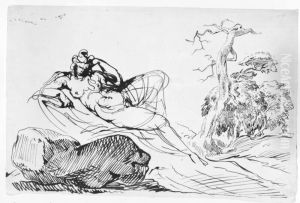 Utkast till relief med skaggig atlet som fordammer en flod och tva lindebarn som vaktas av ett rovdjur