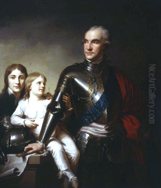 The Count Potocki and His Sons by Johann Baptist von Lampi the Elder is a masterful example of late 18th-century portraiture, radiating the grandeur and refinement of European aristocracy. Painted around 1790, the work captures Count Stanisław Szczęsny Potocki, a prominent Polish nobleman, alongside his sons in a composition that balances formality with intimacy. Lampi’s skill in rendering lush fabrics, delicate lace, and polished surfaces reflects the influence of Rococo elegance, while the dignified poses and restrained palette hint at the emerging Neoclassical sensibilities. The interplay of light and shadow, a hallmark of Lampi’s technique, lends depth to the figures, creating a sense of three-dimensionality. This painting not only exemplifies the artist’s mastery as a court portraitist but also serves as a historical document of the Potocki family’s stature during a turbulent era in Polish history. Its significance lies in bridging the opulence of the Baroque-Rococo tradition with the clarity and restraint of the Neoclassical style, making it a compelling piece for both art historians and admirers of European portraiture.