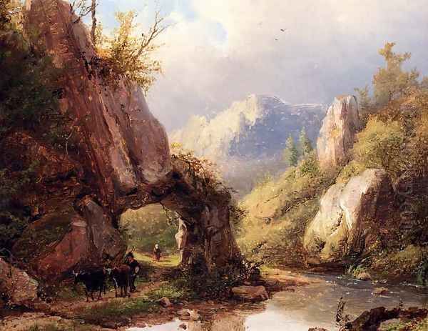 A Mountain Valley With A Peasant And Cattle Passing Along A Stream