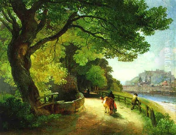 Johann Fischbach’s Blick Auf Die Salzburger Altstadt Mit Der Feste Hohensalzburg Im Hintergrund ("View of Salzburg Old Town with Hohensalzburg Fortress in the Background") is a captivating mid-19th century landscape that masterfully blends Romantic sensibility with Biedermeier precision. Painted circa 1830–1850, the work showcases Salzburg’s iconic medieval fortress looming above clustered rooftops, rendered with meticulous architectural detail contrasting against soft, atmospheric skies—a hallmark of Fischbach’s transition between Romanticism and early Realism. As a key figure of Austrian landscape painting, Fischbach contributed significantly to documenting Alpine topography while infusing scenes with poetic luminosity. This particular composition exemplifies his skill in balancing topographical accuracy with emotional resonance, making it historically valuable both as a cultural record and as an artistic bridge between idealized Romantic vistas and emerging plein-air tendencies later adopted by the Barbizon School.