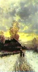 In "Wintersonne," Johann II Jungblut masterfully captures the poetic serenity of winter through his luminous brushwork. Painted in the late 19th century during Jungblut's Düsseldorf period, this oil on canvas exemplifies German Romantic landscape painting at its finest. The scene depicts snow-laden trees bathed in golden afternoon light, their shadows stretching across pristine snow towards a solitary house nestled amid nature’s quietude. Jungblut’s meticulous attention to light effects—particularly the interplay between crisp winter air and soft sunlight—places him firmly within the tradition of atmospheric realism pioneered by artists like Andreas Achenbach. Though less renowned than his contemporaries, Jungblut’s landscapes gained recognition for their meditative quality and technical precision, with "Wintersonne" epitomizing his ability to transform provincial winter scenes into contemplative visual poetry that bridges Romantic emotionality and Biedermeier intimacy.
