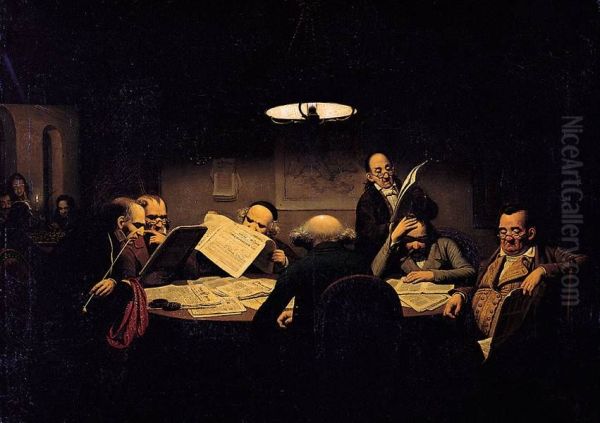 Step into The Reading Room by Johann Peter Hasenclever, and you're immediately drawn into a vivid, almost theatrical scene of 19th-century bourgeois life. Painted in 1843 during the Biedermeier era, this oil-on-canvas work captures a cozy yet lively interior where figures are engrossed in reading, their expressions and postures brimming with casual intimacy. Hasenclever, a German realist painter known for his sharp social commentary and genre scenes, infuses the composition with warm, earthy tones and meticulous detail—from the texture of the wooden furniture to the play of light on folded newspapers. The painting reflects the Biedermeier movement's emphasis on domestic comfort and middle-class values, making it a significant piece in understanding 19th-century European art. Its candid portrayal of everyday life bridges the gap between Romanticism and Realism, offering a quieter but no less insightful counterpart to the grand historical paintings of the time.