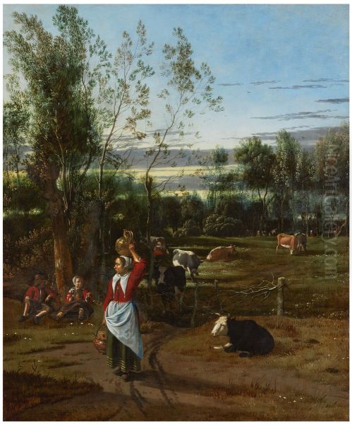 A Milkmaid and Children in a Field, Cattle Grazing beyond