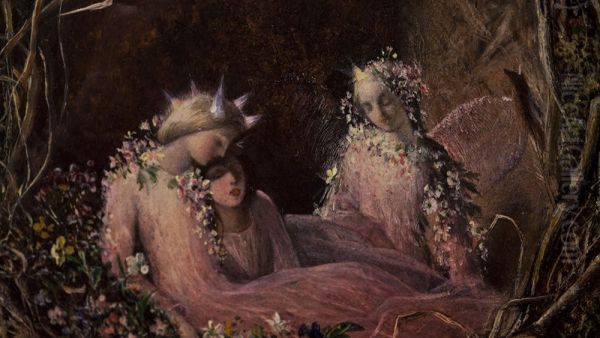 John Anster Fitzgerald’s Fairies Sleeping in a Bird’s Nest (c. 1860) is a mesmerizing example of Victorian fairy painting, a genre that flourished in mid-19th century Britain. This whimsical yet intricate work depicts a group of delicate fairies nestling cozily in an oversized bird’s nest, surrounded by lush foliage and glowing mushrooms. Fitzgerald, known as "Fairy Fitzgerald," masterfully blends Pre-Raphaelite details with Romanticism’s dreamy sensibility, creating an otherworldly atmosphere. The painting’s ethereal glow and meticulous realism reflect the Victorian fascination with the supernatural and childhood fantasy. Though less famous than his contemporaries like Richard Dadd, Fitzgerald’s works are prized for their unique charm and technical finesse, embodying the era’s intersection of nostalgia, escapism, and artistic innovation.