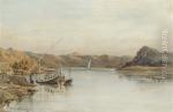 On The Nile by John Jnr. Varley is a mesmerizing 19th-century watercolor that captures the tranquil majesty of the Nile River with an almost poetic sensibility. Varley, a key figure in the British watercolor movement, masterfully blends Romanticism’s emotional depth with topographical precision, creating a luminous, dreamlike landscape. The painting’s soft washes of azure and gold evoke the play of sunlight on water, while distant palms and ancient ruins hint at the exotic allure of Egypt—a popular subject among Victorian travelers. As a member of the Society of Painters in Water-Colours, Varley helped elevate the medium to fine-art status, and this work exemplifies his skill in balancing atmospheric effect with meticulous detail. Its historical significance lies in bridging European Romanticism and Orientalist fascination, offering both artistic and cultural insights.