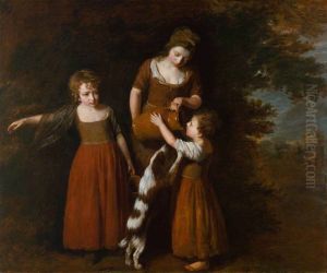 Girl Seated In A Landscape With A Dog And Basket Of Fruit