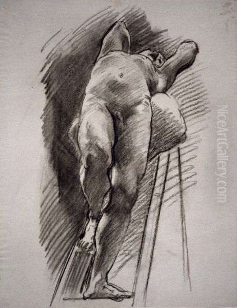 In John Singer Sargent's Naken man lutad mot en stege (Nude Man Leaning Against a Ladder), the luminous play of light caresses the model’s muscular torso against a softly brushed, impressionistic background. Executed around 1916–1918 during his experimental period, this oil study reveals Sargent’s virtuosity in capturing both anatomical precision and fleeting atmosphere—a hallmark of his transitional style between academic realism and looser, more expressive brushwork. Though lesser-known than his society portraits, this intimate work showcases his mastery of chiaroscuro and the male form, aligning with Renaissance-inspired life studies while anticipating modernism’s fluidity. It occupies a quiet but significant niche in art history, reflecting Sargent’s private dedication to the raw human figure beyond public commissions.