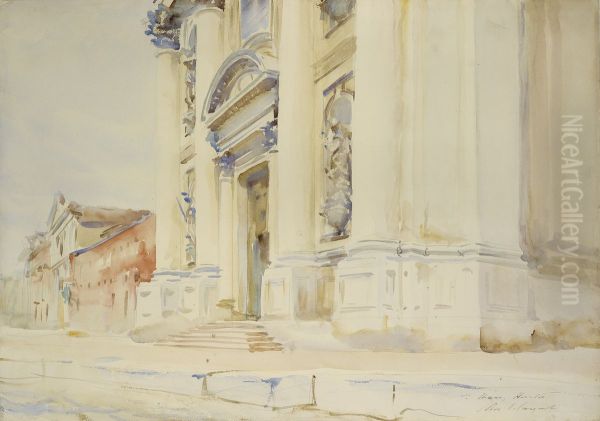 In John Singer Sargent's luminous watercolor Santa Maria dei Gesuati, Venice, sun-drenched warmth and effortless elegance transport viewers to a serene Venetian afternoon. Painted circa 1904-1908 during Sargent’s prolific period capturing European architecture, the piece showcases his mastery of light—translucent washes of ochre and blush pink animate the Baroque church façade, while deft graphite lines suggest intricate carvings without overwhelming the composition. Unlike his formal portraits, this work embodies plein air spontaneity, marrying Impressionism’s fleeting effects with Academic precision in depicting marble textures and shadow play. Historically, it reflects Sargent’s shift toward architectural subjects post-1900, cementing his reputation as a virtuoso of both figure and place. The painting’s intimacy—eschewing Venice’s clichéd gondolas for quiet artistry—positions it as a quieter gem among his Venetian series, beloved for its poetic restraint.