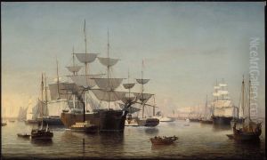 "Setting Sail Off The Coast" by John Wilson Carmichael captures the dynamic energy of 19th-century maritime England with breathtaking vitality. Painted in the 1840s during the golden age of British marine painting, this oil masterpiece showcases Carmichael’s signature romantic realism—where turbulent waves, meticulously rendered ships, and dramatic cloudscapes converge. The composition balances the raw power of nature against human endeavor, as vessels bravely cut through choppy waters under a sky alive with luminous, wind-swept brushstrokes. As a key figure of the Newcastle School, Carmichael elevated marine art beyond topographical recording, infusing it with emotional depth and atmospheric drama. This work perfectly embodies the Victorian era’s fascination with seafaring glory, standing alongside Turner’s seascapes in art historical significance while retaining Carmichael’s distinctive coastal intimacy.