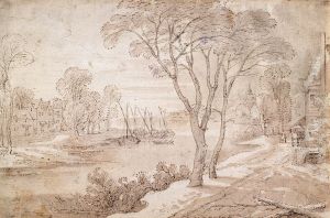 Extensive River Landscape With Figures On A Road And A View Of A Town