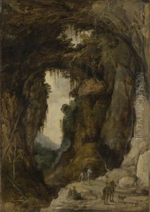 Extensive Rocky Landscape With Figures Resting By A Grotto