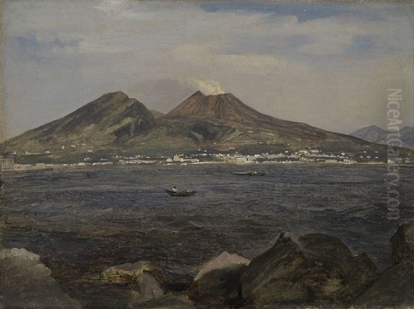 In Josef Rebell’s Blick auf den Golf von Neapel mit dem Vesuv, the serene grandeur of the Bay of Naples unfolds beneath the towering presence of Mount Vesuvius. The painting captures a luminous Mediterranean sky reflecting on calm waters, with distant sailing boats dotted along the horizon, blending realism with Romantic idealism. Rebell, an early 19th-century Austrian landscape painter, studied in Italy and was deeply influenced by the veduta tradition—topographic views infused with atmospheric drama. His mastery of light and meticulous details evoke both tranquility and the sublime power of nature, characteristic of the late Neoclassical period bridging to Romanticism. The work holds significance in art history as an exemplary fusion of Northern European precision and Southern luminosity, embodying the era’s fascination with Italy as an artistic paradise. Commissioned by aristocratic patrons, Rebell’s paintings adorned palaces, reflecting a cultural zeitgeist that prized idealized landscapes as symbolic escapes.