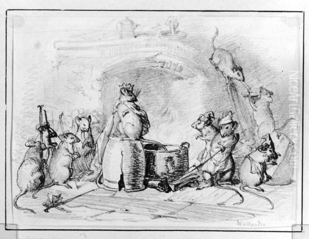 Josef Wilhelm Wallander’s illustration "Suppe paa en polsepind" (Soup on a Sausage Peg) captures the whimsical charm of Hans Christian Andersen’s fairy tale with exquisite detail. The scene brims with Nordic folklore’s playful absurdity, depicting a poor soldier concocting an imaginary feast from a single sausage peg—a testament to Andersen’s themes of resourcefulness and imagination. Rendered in Wallander’s signature mid-19th-century Romantic style, the artwork balances delicate linework with warm, earthy tones, evoking both nostalgia and fantasy. Active during Sweden’s Golden Age of illustration, Wallander bridged theatrical storytelling and visual art, making this piece a fine example of how literature influenced Scandinavian decorative arts. Though less renowned internationally, his works remain cherished for their narrative depth and technical finesse, offering a window into the era’s illustrative traditions.
