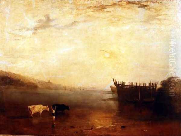 Standing before Turner’s Teignmouth Harbour, c.1812, one is enveloped in the luminous mystery of early Romanticism. Painted during Turner’s prolific middle period, the work captures Devon’s bustling port with a masterful interplay of light and atmosphere—dawn or dusk gilding the sails and shimmering on tranquil waters, while soft, blurred forms suggest the dynamic interplay of human activity and nature. This piece exemplifies Turner’s transition from topographic precision to his later, more expressive style, foreshadowing the emotive abstraction that would define his legacy. Historically, it reflects England’s maritime pride during the Napoleonic Wars, while artistically, it bridges Enlightenment detail and Romantic emotion. Today, it’s celebrated as a testament to Turner’s genius in elevating landscapes beyond mere representation into poetic evocations of light and mood.