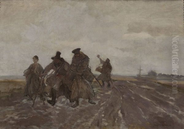 Józef Chełmoński’s On the Road (Polish: Na przełaj) is a captivating 19th-century masterpiece that transports viewers to the raw, untamed beauty of the Polish countryside. Painted in 1879 during Chełmoński’s realist period, the work depicts a lone horse-drawn wagon struggling through muddy terrain under a stormy sky, evoking a sense of resilience and harmony with nature. The dramatic contrasts of light and shadow, along with the textured brushwork, exemplify Chełmoński’s keen observational skills and his dedication to portraying rural life authentically. As a leading figure of Polish Realism, Chełmoński’s works, including this one, hold a significant place in Eastern European art history, bridging Romantic emotionality and the emerging Naturalist movement’s precision.
