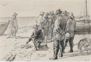 Jozef Israels' Garnalenvisser (The Shrimp Fisher) is a poignant masterpiece of 19th-century Dutch Realism, capturing the quiet endurance of coastal laborers. The painting depicts a solitary fisherman hunched over his basket, his weathered face and rough hands illuminated by soft, diffused light, evoking both dignity and weariness. Israels, influenced by the Hague School, employs muted earthy tones and loose brushwork to create an intimate, almost melancholic atmosphere. The work reflects his deep empathy for the poor, aligning with the broader Social Realist movement’s focus on everyday struggles. Garnalenvisser* is celebrated for its emotional depth and technical mastery, cementing Israels’ reputation as the "Dutch Millet" and a pivotal figure in 19th-century European art.