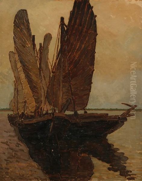 In Jules Galland's serene masterpiece Annam, Barques De Peche, the viewer is transported to the tranquil waters of coastal Annam (present-day Vietnam), where slender fishing boats glide effortlessly under a soft, hazy sky. Galland, a 19th-century French Orientalist painter, captures the poetic stillness of dawn or dusk with delicate brushstrokes, his Impressionist-infused realism lending luminosity to the scene. The composition balances quiet solitude—embodied in the fishermen's subdued postures—with the rhythmic beauty of reflections dancing on the water. Though less renowned than his contemporaries like Monet, Galland’s work holds significance for its ethnographic sensitivity, documenting Southeast Asian livelihoods with a rare blend of lyricism and precision. The painting’s subdued palette and atmospheric perspective reflect European Orientalist trends while avoiding exoticization, offering instead an intimate vignette of daily life.