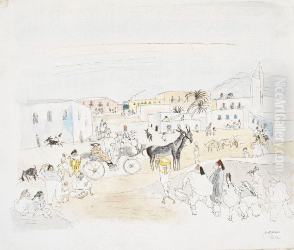 Jules Pascin’s Landscape with Carriage and Figures, Tunis is a vibrant snapshot of early 20th-century Tunisia, radiating warmth and movement through its loose, expressive brushwork. The painting captures a sun-drenched scene—dusty roads, a horse-drawn carriage, and figures draped in flowing garments—imbued with Pascin’s signature blend of spontaneity and melancholy. Created during his travels in North Africa, the work reflects his fascination with light and local life, merging Post-Impressionist freedom with subtle Fauvist color contrasts. Though less celebrated than his figural works, this piece exemplifies Pascin’s ability to distill atmosphere and cultural essence onto canvas, bridging European modernism and exotic locales. Its historical significance lies in documenting the cross-cultural dialogues that shaped interwar art, offering a quieter yet evocative counterpoint to contemporaries like Matisse or Klee.