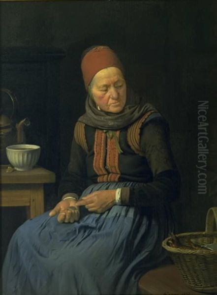 Julius Exner’s En amagerkone (An Amager Woman) is a charming 19th-century genre painting that captures the warmth and simplicity of Danish rural life. The artwork portrays an elderly woman from Amager, a region known for its traditional costumes and distinct cultural identity, seated in a cozy interior with rich textile details. Exner’s meticulous attention to texture—whether in the woman’s intricately embroidered dress, the woven basket, or the soft play of light filtering through the window—creates an intimate, almost nostalgic atmosphere. As a leading figure of the Danish Golden Age, Exner specialized in scenes of folk life, blending realism with subtle romanticism. The painting serves as both a historical document of Amager’s heritage and a fine example of the period’s emphasis on national identity and everyday beauty. Today, it is admired for its craftsmanship and its tender, humanistic portrayal of a vanishing way of life.