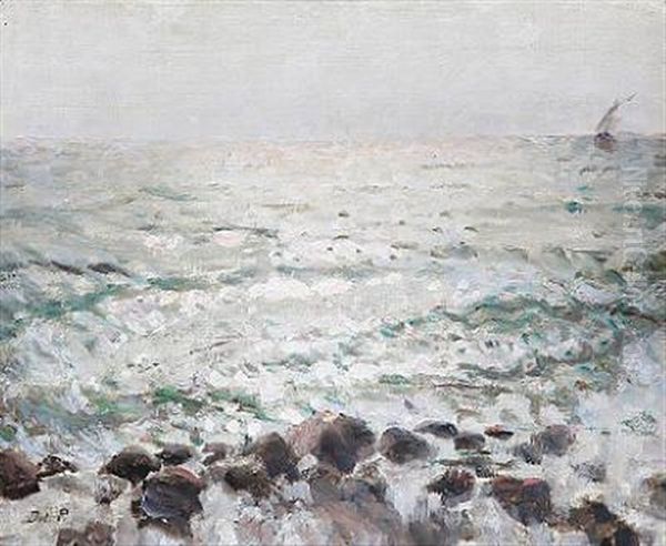The Breakers in Sharp Sunlight by Julius Paulsen (1860-1940) is a luminous example of Danish Symbolist and early Modernist painting, capturing the raw energy of the sea under dazzling daylight. Paulsen, known for his emotive brushwork and mastery of light, portrays the churning waves with dynamic impasto strokes, where foamy crests dissolve into prismatic reflections. Painted during Denmark's artistic shift toward expressive naturalism, this work balances observational precision with dreamlike atmosphere—a hallmark of Paulsen’s later style. Its historical significance lies in bridging 19th-century Romanticism and 20th-century abstraction, influencing Scandinavian plein-air painting. The dramatic contrast between the brooding ocean depths and shimmering surface light evokes both nature’s grandeur and ephemeral beauty.
