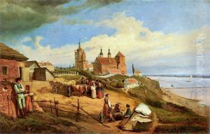 Juliusz Kossak's Z Pana Jowialskiego (1889) transports viewers to a vibrant slice of Polish noble life in the 19th century. The painting, rich in historical detail and romantic flair, captures a lively scene—likely inspired by Aleksander Fredro’s comedy Pan Jowialski—where elegantly dressed figures on horseback embody the era’s aristocratic charm. Kossak, a master of equestrian and historical subjects, employs a dynamic composition with meticulous attention to period costumes, expressive gestures, and a lush, earthy palette. His work reflects the Polish Romantic tradition, blending realism with nostalgic idealism, and solidifies his reputation as a chronicler of Poland’s cultural heritage. The painting’s energy, coupled with its storytelling depth, makes it a significant piece in Eastern European art history, celebrating both national identity and artistic craftsmanship.