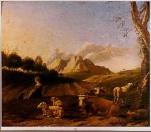 Herdsmen Resting In An Italianate Landscape, A Hilltop Town Beyond