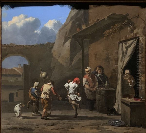 Karel Dujardin’s Dansende en musicerende kinderen voor een herberg (Dancing and Music-Making Children Outside an Inn) captivates with its lively rustic charm. Painted around 1660 during the Dutch Golden Age, this small-scale oil on panel (typically measuring under 50 cm) exudes warmth through its harmonious balance of genre scene intimacy and Italianate luminosity. Dujardin, renowned for merging Dutch realism with Mediterranean influences, depicts peasant children reveling near a sun-dappled tavern—their animated gestures and crumpled linen clothing rendered with exquisite textural detail. The composition’s diagonal flow, guided by a donkey and towering tree, amplifies the spontaneity of rural joy while showcasing the artist’s mastery of tonal gradations in earthy ochres and slate blues. As one of Dujardin’s signature bambocciate (small everyday scenes), this work epitomizes the 17th-century shift toward humanized narratives in art, bridging Vermeer’s domestic poetry with Brouwer’s earthy vigor. Its enduring appeal lies in the delicate equilibrium between idealized light and unfiltered humanity.