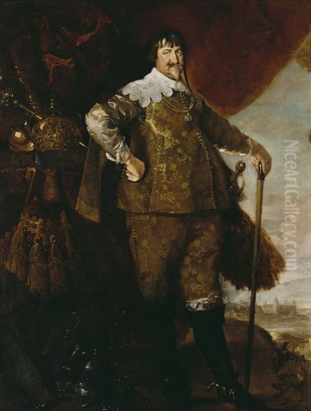 The portrait Christian IV, King of Denmark (1577–1648) by Karel van Mander III captures the grandeur and authority of the famed Danish monarch with a striking baroque sensibility. Painted in the early 17th century, the artwork exemplifies the Northern Mannerist tradition, blending meticulous detail with regal pomp—characteristic of royal portraiture of the era. Christian IV, known for his ambitious building projects and military campaigns, is rendered with an imposing presence, his gilded attire and ceremonial regalia illuminated against a dark, atmospheric background. Van Mander's mastery in texture—from the delicate lace collars to the reflective sheen of armor—evokes both opulence and power. Historically significant, this work reflects the political propaganda of absolute monarchy, while stylistically bridging Renaissance precision with Baroque dynamism, making it an important piece in understanding Northern European court portraiture.