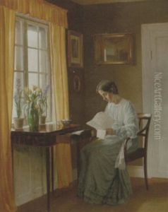 Interior Med Siddende Kvinde, Der Betragter En Syrenbuket